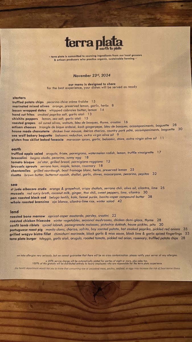 At Terra Plata, you’ll find a menu that is both daring and comforting. As soon as you step through the doors, the atmosphere envelops you; it’s warm and inviting with a touch of rustic elegance. For dinner, don't miss out on their stunning seafood selection, with Mussels & Clams ($30.00) that boast a delectable blend of brininess and freshness. The Sockeye ($46.00) and Rainbow Trout ($42.00) both provide an exquisite taste of the ocean, impeccably prepared to highlight the natural flavors.